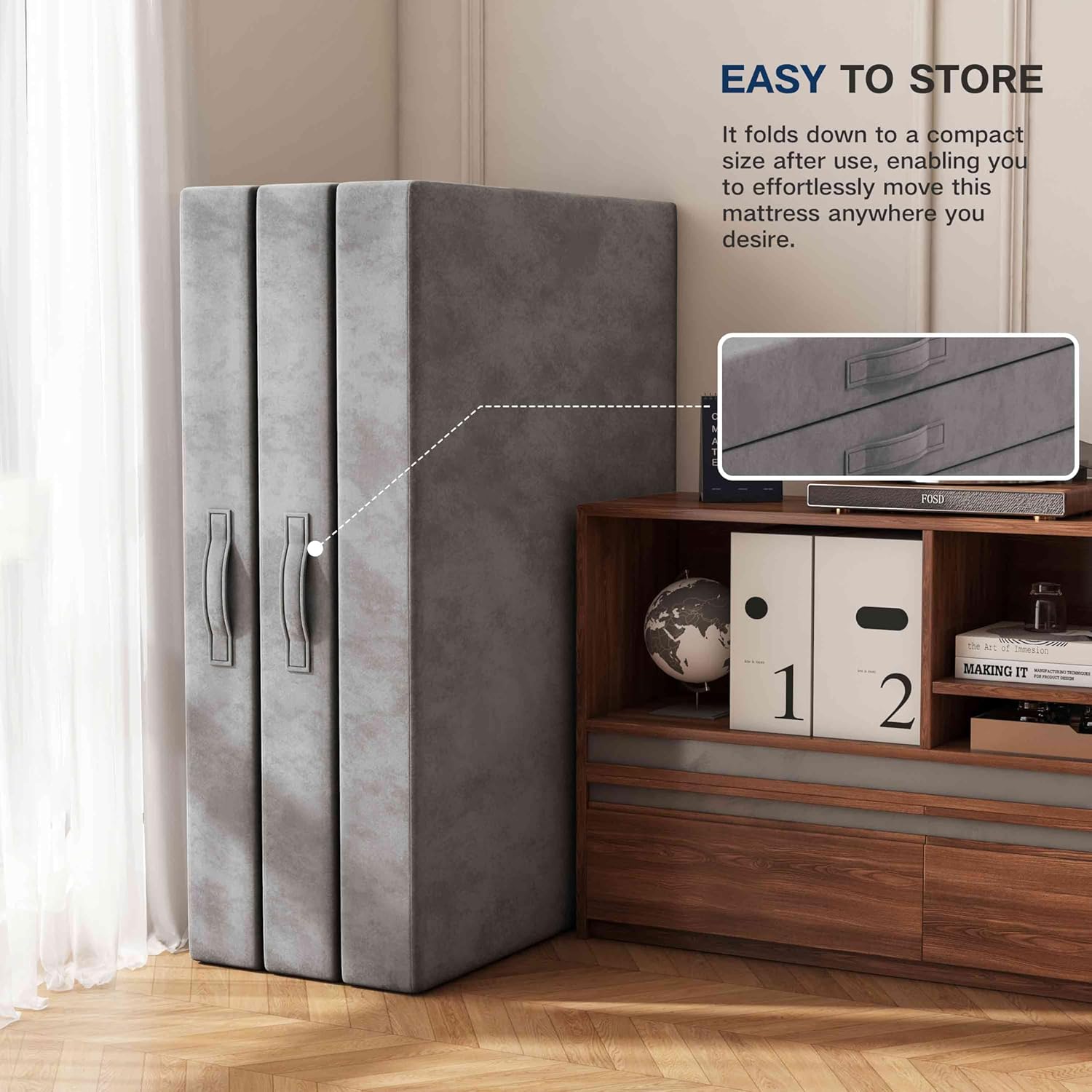 - Store the tri-fold mattress folded upright in a dry place when not in use. Use the built-in handles to move it without bending the foam excessively.